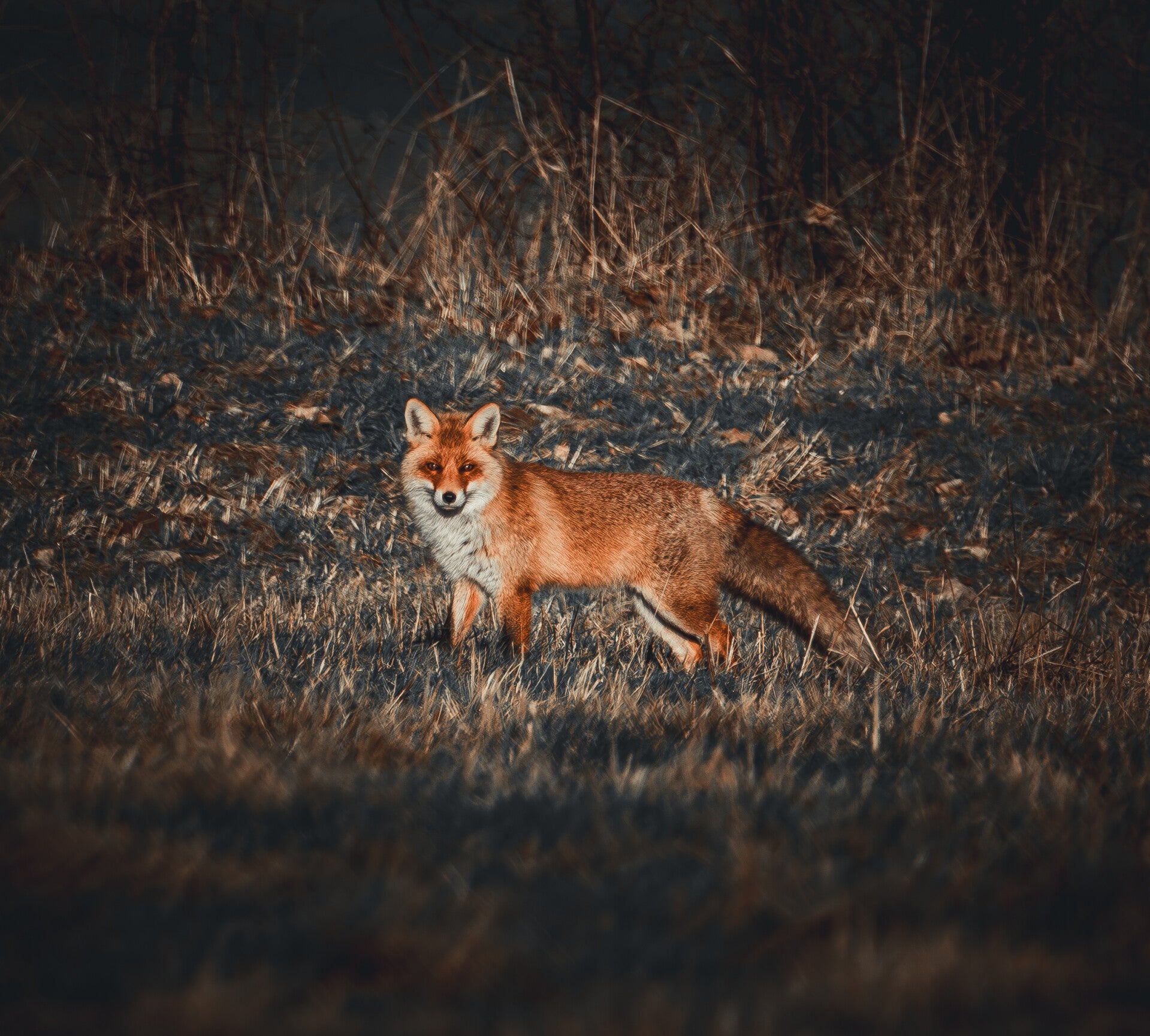 Im finalen Bild entfaltet sich die Szene neu. Das Fell wirkt lebendiger, die Farben klarer, die Tiefe stärker. Der Fuchs tritt aus dem Hintergrund heraus, ohne unnatürlich zu wirken. Die Bearbeitung hebt hervor, was der Moment bereits in sich trug – sie erfindet nichts dazu, sie verstärkt nur das, was schon da war.